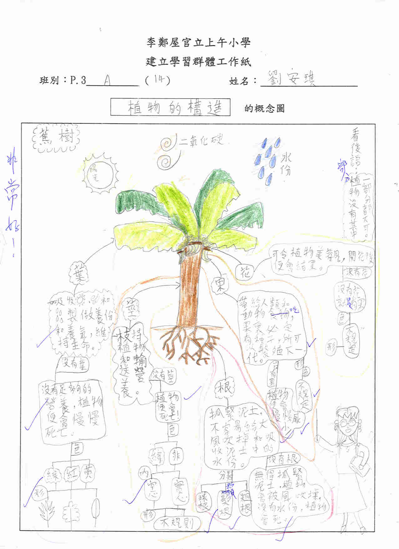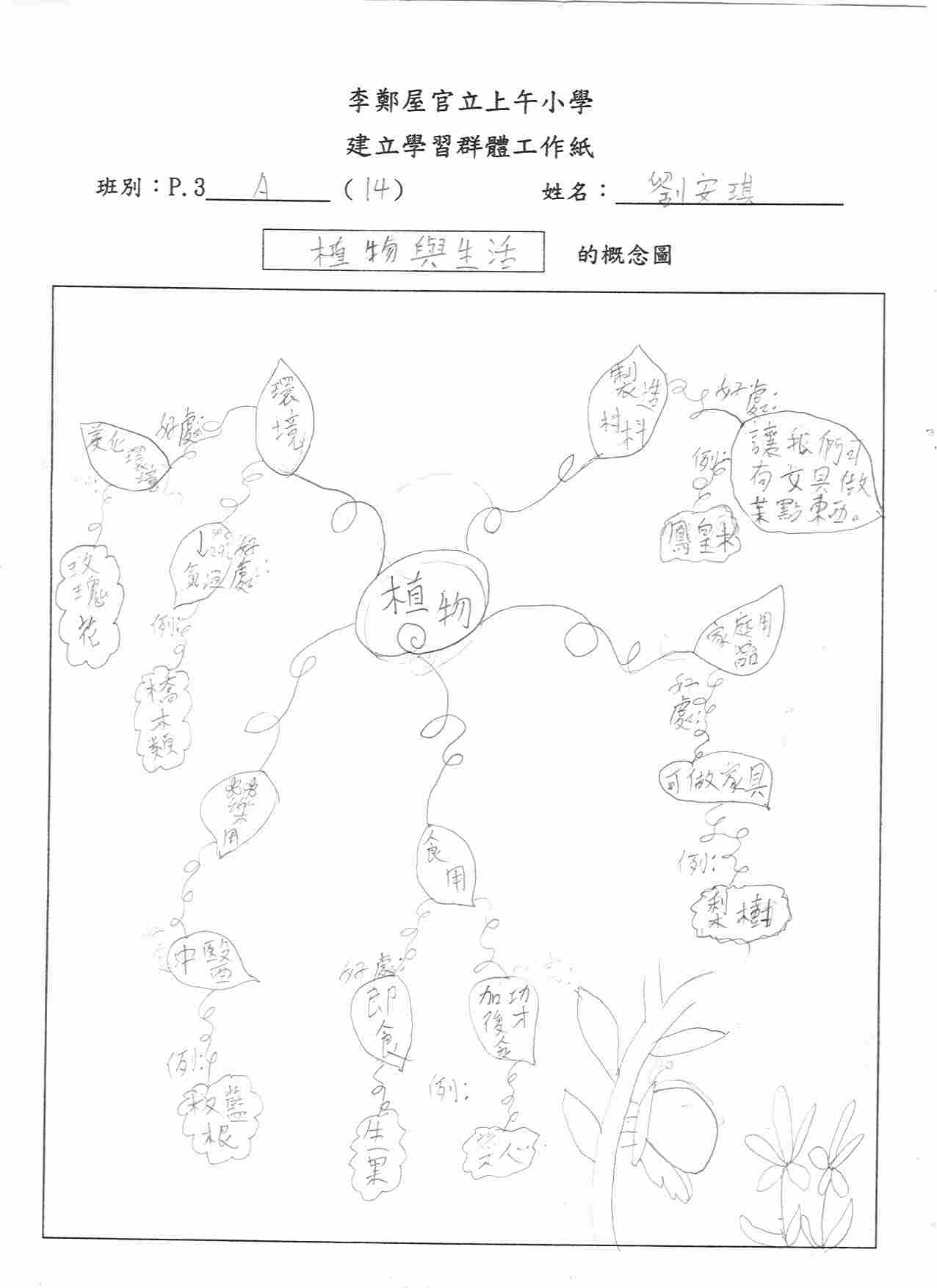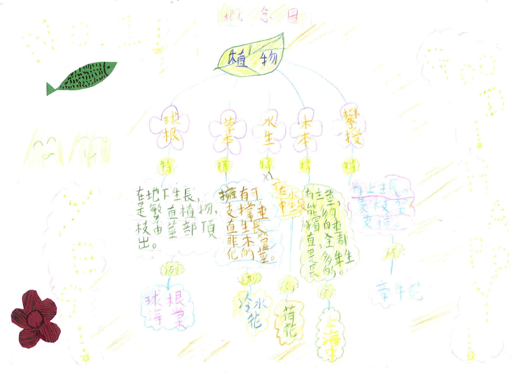 為培養學生的觀察力、聯想力、創意及學習興趣,教師著學生回家選取有興趣的事物,然後設計成能表達分層架構的概念圖,回校與同學分享(見圖c)。 |