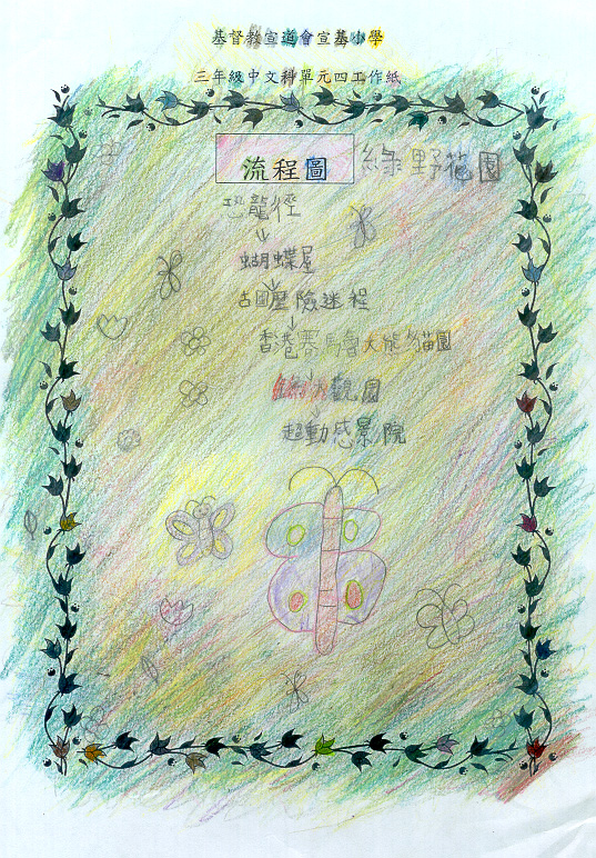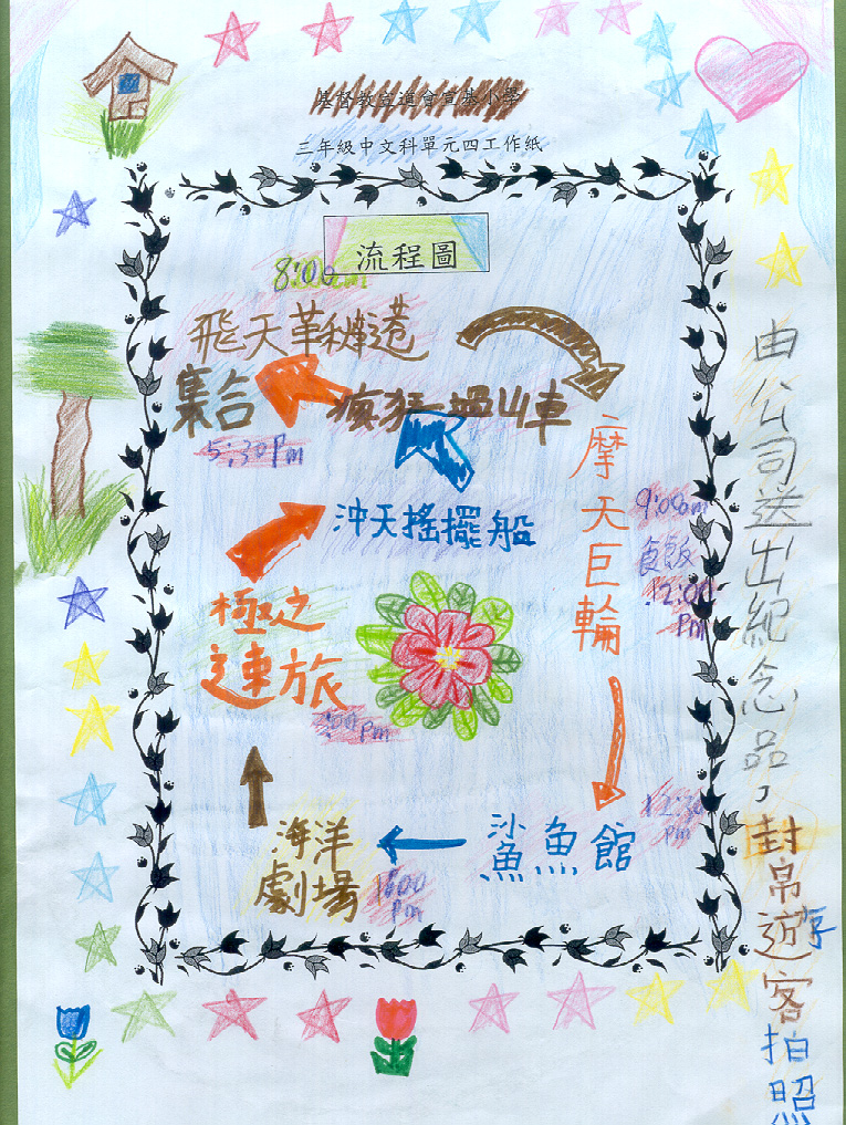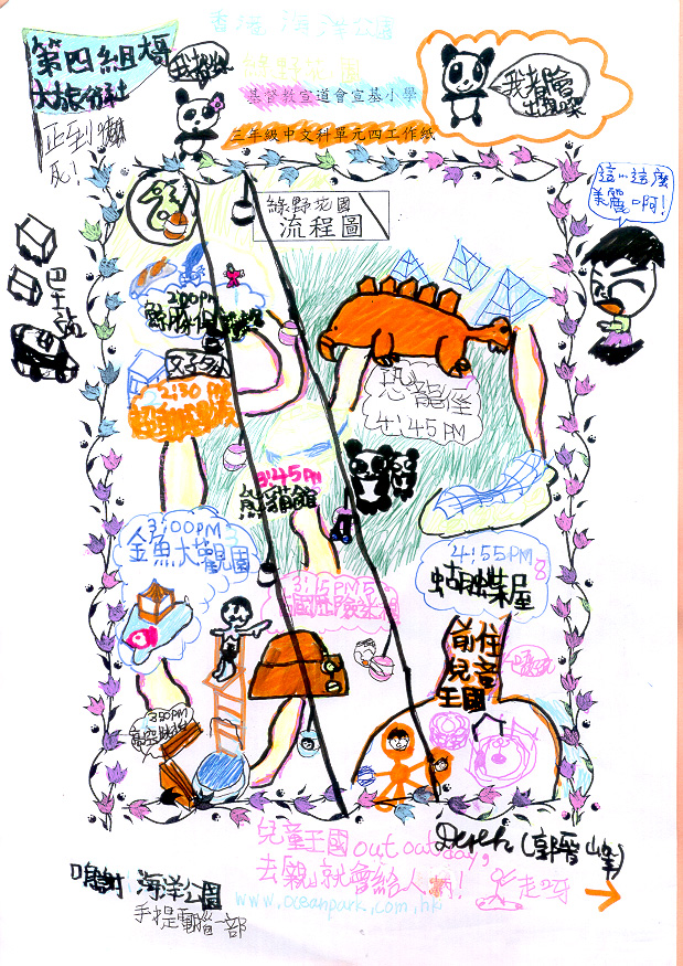 在緊接的課節,教師安排學生分成較大的小組。組內成員須擔當不同的工作包括設計流程圖(見圖g, h)、撰寫海洋公園行程簡介(見圖i, j)、繪畫插圖(見圖k, l)、監察小組工作進度、檢查及協助修訂成員作品等。 |