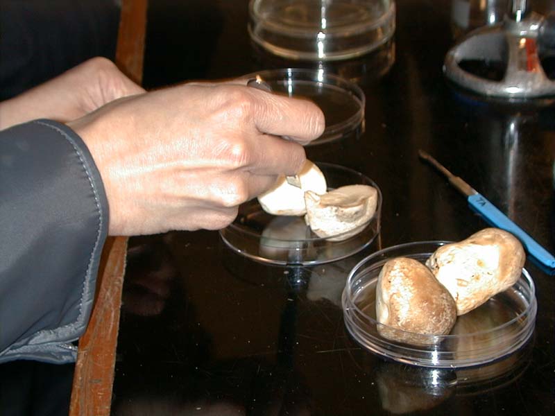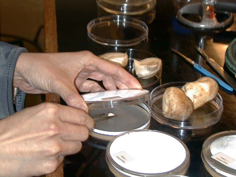 Aseptically inloculate mushroom tissue onto a potato dextrose agar